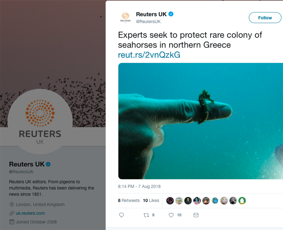 Reuters.com @ Twitter: Experts seek to protect rare colony of seahorses in northern Greece